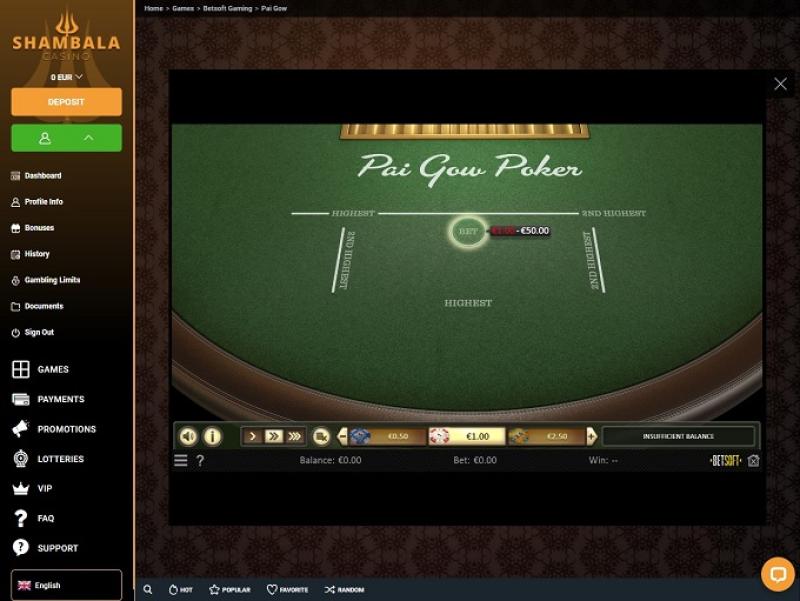 Os jogos de mesa mais populares no Shambala são: Quadra de um Tipo, Bonus Poker, Áses e Oitos (1 mão), Áses e Oitos (10 mãos), Áses e Oitos (100 mãos), Áses e Oitos (5 mãos), Áses e Oitos (50 mãos), All American Poker (1 mão), All American Poker (10 mãos), All American Poker (100 mãos), All American Poker (5 mãos), All American Poker (50 mãos), Blackjack 7, Bonus Deuces Wild (10 mãos), Bonus Deuces Wild (100 mãos), Bonus Deuces Wild (5 mãos), Bonus Deuces Wild (50 mãos), Bonus Poker (1 mão), Bonus Poker (10 mãos), Bonus Poker (100 mãos), Bonus Poker (5 mãos), Bonus Poker (50 mãos), Casino Hold'em, Deuces Wild e Deuces Wild (1 mão).