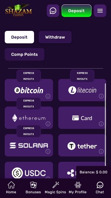Existem diversos métodos de pagamento disponíveis que os membros registrados podem usar para fazer depósitos e saques no Shazam.