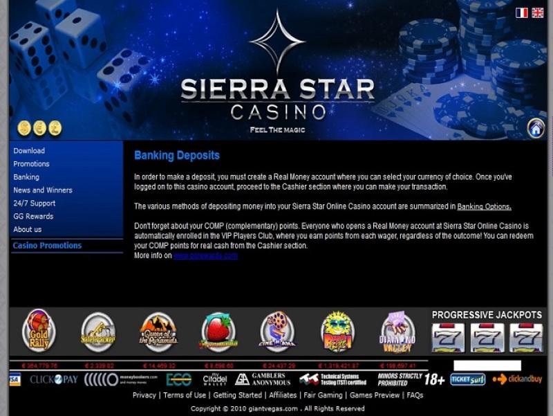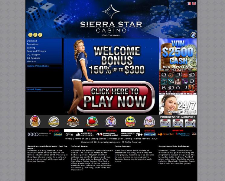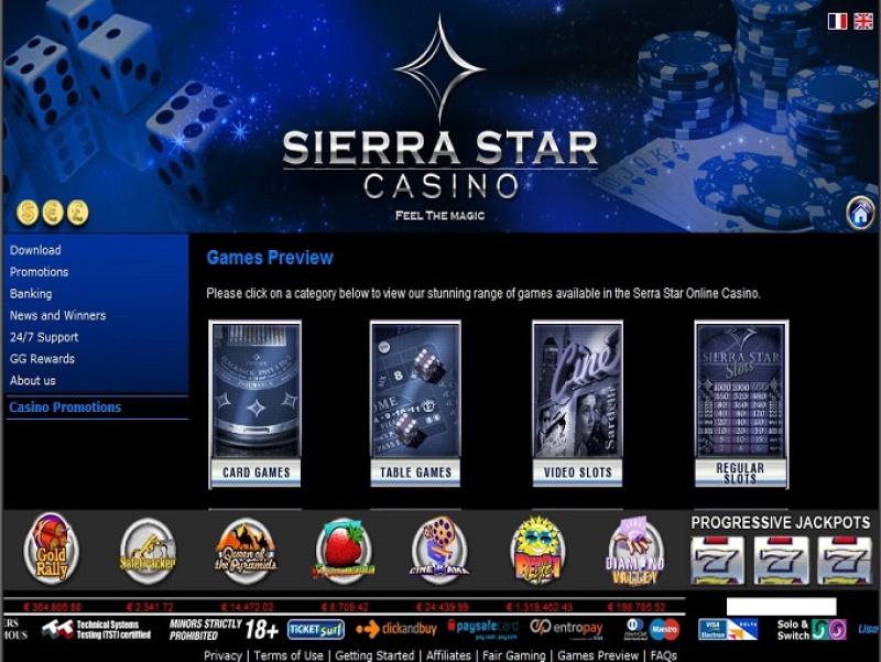 O Sierra Star Casino é alimentado por Playtech , o que proporciona ao casino uma biblioteca de jogos acessível tanto através de um software para download como por um modelo de jogo instantâneo que permite jogar diretamente no seu navegador web.Blackjack