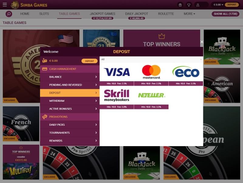 O Simba, um dos cassinos da SkillOnNet, oferece um bom conjunto de bônus de depósito. No entanto, os Termos e Condições do bônus não são favoráveis aos jogadores. A regra de aposta máxima para Neteller e Skill é muito estranha, sendo de apenas 1 euro (ou 1 dólar americano). Não sei como eles criam esse tipo de cláusula. Na verdade, a seleção de jogos da SkillOnNet não é ruim. Basta prestar atenção aos Termos e Condições do bônus antes de jogar.