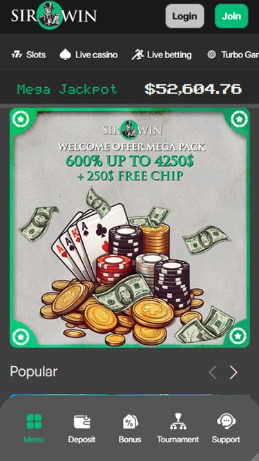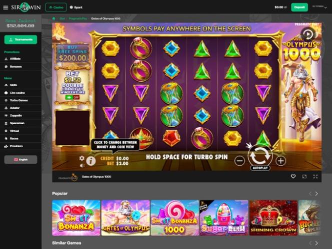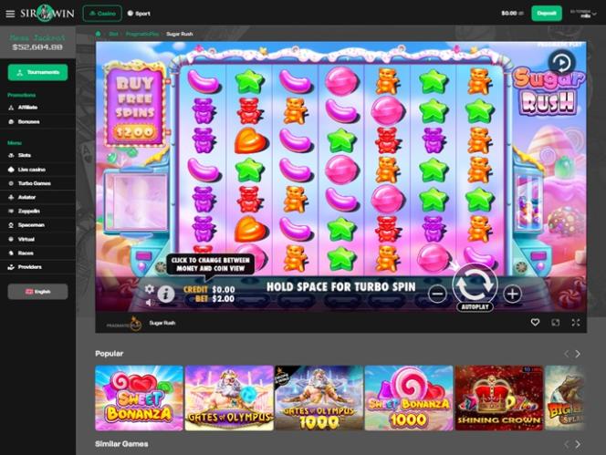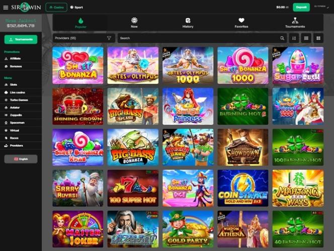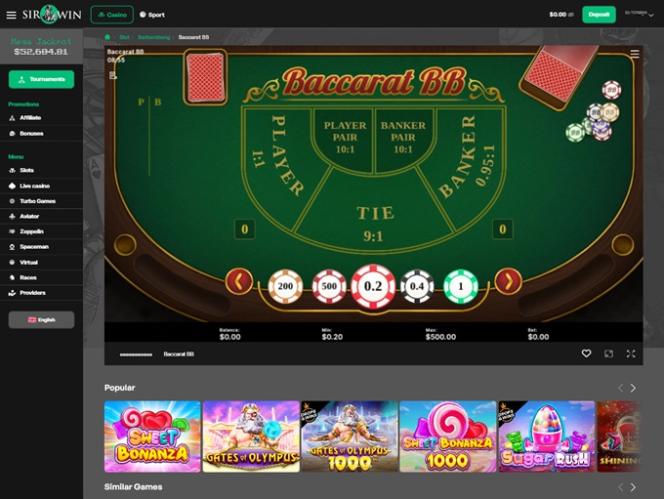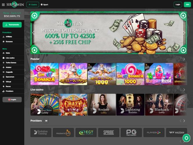 A solução gráfica criativa do cassino e o padrão de cores inspirado em dinheiro criam uma atmosfera de jogo agradável. Todos os detalhes parecem nítidos e organizados, e a impressão geral é de que tudo aqui é bem estruturado. O cadastro é simples e os jogadores não precisam de muito tempo para encontrar seu conteúdo de jogo favorito no SirWin Casino, especialmente se estiverem interessados em jogar Aviator, Spaceman, Zeppelin, Pilot, Goal, Plinko, Hilo, Sultan's Gift, Drunk Santa, The Mystery Of Faberge, Cash Galaxy, Dice, High Low, Vortex, Ball & Ball, Lucky Numbers X20, Mini Roulette, Lucky Numbers X12 e outros títulos em destaque.