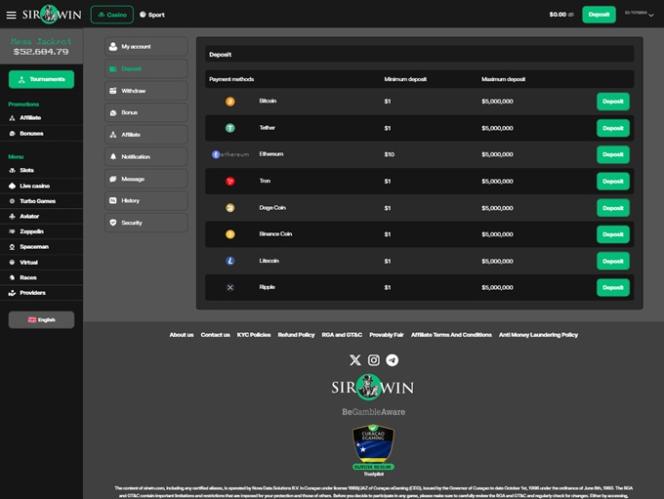 O SirWin Casino é um cassino online e operador de apostas esportivas focado principalmente em jogadores do Canadá, Finlândia e Alemanha. Este site pertence a uma empresa estabelecida sob as leis de Curaçao, licenciada e regulamentada pelo Governo de Curaçao.