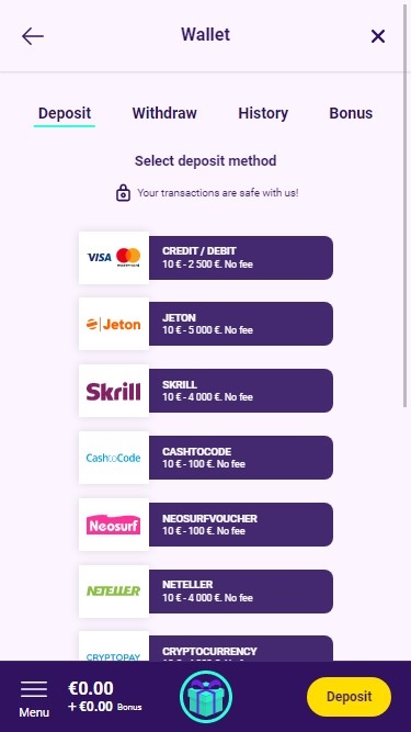 Este site de jogos de azar possui uma interface agradável e bem organizada. As cores azul-marinho e turquesa neon formam uma combinação interessante que domina esta plataforma de cassino online fácil de usar. A barra lateral esquerda contém o menu do cassino e diversas abas bem categorizadas que proporcionam acesso fácil aos jogos e a todas as outras seções do cassino.