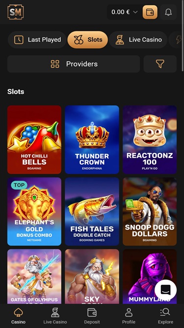 No canto superior direito, você encontrará o de sempre: as configurações do seu perfil, além do botão de depósito que permite adicionar fundos à sua conta imediatamente. E não se preocupe, também há uma barra de pesquisa que ajudará você a encontrar seus jogos de cassino favoritos rapidinho , ou seus provedores favoritos, caso esteja indeciso sobre qual jogo escolher!