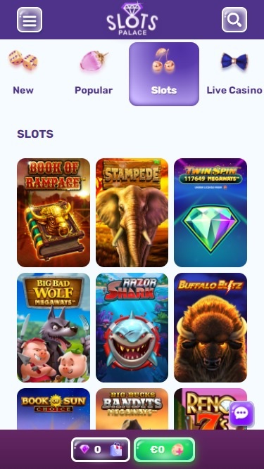 Alguns dos títulos recomendados no SlotsPalace são: Book Of Rampage, Stampede, Twin $pin 117649 Megaways, Big Bad Wolf Megaways, Razor Shark, Buffalo Blitz, Book Of Sun Choice, Big Bucks Bandits Megaways, Reno 7s, Mystery Of Eldorado, San Quentin X Ways, Joker Win, Eye of Anubis, Gonzo's Gold, Fire In The Hole, Fat Drac, Siberian Wolf, Sakura Fortune, Black Wolf Hold And Win, Wolf Fang, Ramses Rising, Buffalo Power Hold And Win, Golden Glyph 2, Deadwood, Jammin' Jars, Sticky Bandits Wild Return, Vikings Go Berzerk, Book Of Diamonds, Fire Blaze Jackpots Blue Wizard, Shining Crown, Tiger's Glory, 10000 Wishes, Hallow Pick, Super Sevens & Fruits 6 Reels, Bankin' Bacon, Dark Reels, Atlantis Ca$H Collect, Halloween Fortune Scratch, Full Moon Wild Track, Retro Abóbora, Gator Gold Gigablox, Riquezas de Midgard: Conquiste e Expanda, Roma: A Era de Ouro, Livro do Elixir, Livro de Hor, Conquestera, Monstro Perigoso, Fortuna Cinco, Fortuna Três, Leão Furioso, Trono de Camelot, Tribo, Reator Atômico, Lorde Fortuna 2 - Segure e Ganhe, História de Hércules...