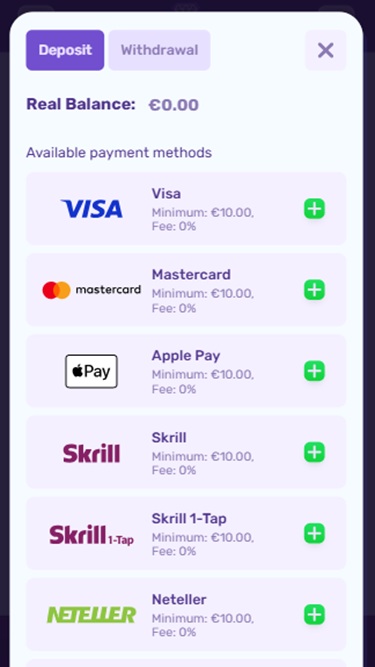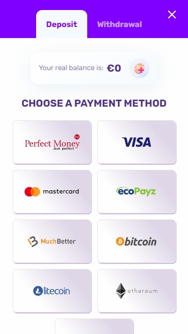 A interface do cassino é otimizada para múltiplas plataformas e se adapta perfeitamente a todos os dispositivos, sejam eles desktops ou dispositivos móveis. Ela é clara graças a um tema com modo claro, mas também muito vibrante, pois seu design utiliza formas 3D coloridas combinadas com uma paleta de cores roxa e dourada.