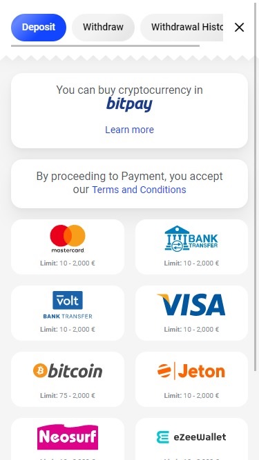 O sistema "Cashbox" do cassino oferece suporte a uma ampla variedade de métodos de pagamento para depósitos e saques, incluindo opções de criptomoedas, cartões de pagamento, diversas carteiras eletrônicas populares e seguras, além de transferências diretas de dinheiro.