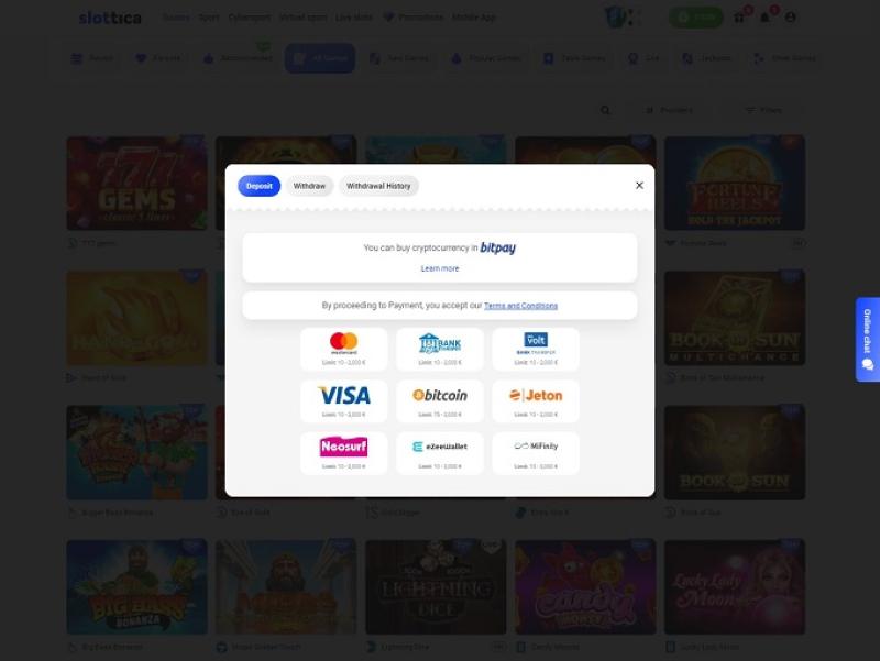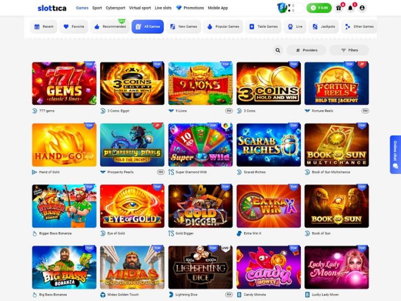 Como esperado, o Slottica oferece inúmeras aventuras de slots populares e envolventes, mas o cassino também proporciona muita emoção aos apostadores em todas as categorias disponíveis: Jogos, Esportes, Ciberesportes, Esportes Virtuais e Slots ao Vivo.