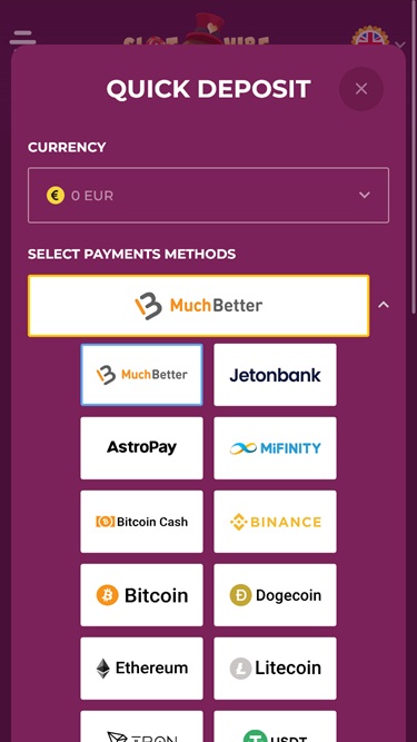 Segue a lista de métodos de pagamento do SlotVibe Casino:
