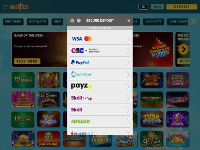 O Slotzo Casino é alimentado por Amaya, Microgaming, Net Entertainment, BetSoft, 1x2gaming, Amatic Industries, Barcrest, Big Time Gaming, Evolution Gaming, EYECON, Ezugi, iSoftBet, lightningboxgames, Oryx, Play'n GO, playson, Quickspin, Yggdrasil, Wazdan, Realistic Games, Booming Games, Stakelogic, Pragmatic Play, GAMING1, Red Tiger Gaming, Spinomenal, Red Rake Gaming, Skillzzgaming, Fantasma Games, SYNOT Games, Skywind, Triple Edge Studios, Northern Lights Gaming, Stormcraft Studios, All41 Studios, Gluck Games, Gameburger Studios, Pulse 8 Studios, Shuffle Master, SpinPlay Games, Real Dealer Studios, Games Global, Wizard Games, Ainsworth, Bally Technologies, bluberi, Blueprint Gaming, Endemol Games, NextGen, Pariplay, Tom Horn Gaming, WMS, Inspired Gaming, Gaming Realms, SG Interactive, Gamomat, Red7Mobile, Scientific Games, Reel Time Gaming, Authentic Gaming, betiXon, Bally Wulff, Iron Dog Studio, Old Skool Studios, Foxium, Betdigital, Just For The Win, Reflex Gaming, PearFiction Studios, Wild Streak Gaming, Slingshot Studios, Fortune Factory Studios, RubyPlay, 4ThePlayer, AvatarUX, Gamevy, High 5 Games, ReelPlay, Alchemy Gaming, Snowborn Games, Hacksaw Gaming, Bang Bang Games, Slotmill, Peter And Sons, Lucksome Gaming, Area Vegas, Leap Gaming, Wishbone Games, Spribe, INO Games, Nailed It! Games, Atomic Slot Lab, Neko Games, Reel Kingdom, Oros Gaming, Indigo Magic and Light & Wonder e o site possui uma plataforma web que carrega através do seu navegador de internet. O site tem um design agradável e é fácil de navegar. Você também encontrará compatibilidade com dispositivos móveis, permitindo que você aposte em seu smartphone ou tablet.