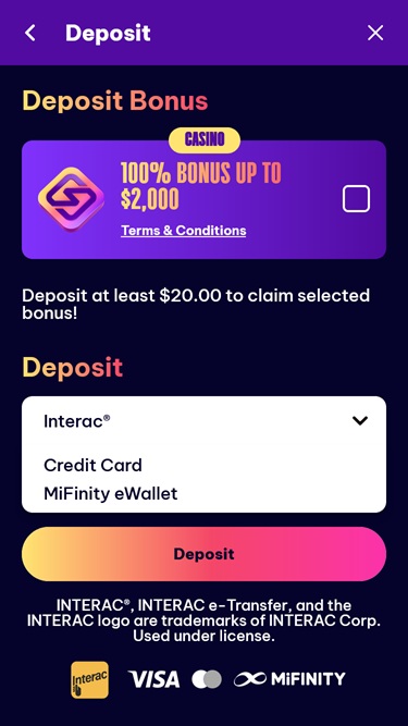 Visualmente, o site apresenta uma interface de usuário leve e um design minimalista, resultando em tempos de carregamento incrivelmente rápidos e navegação fácil. Ao mesmo tempo, a paleta de cores apresenta fundos mais escuros e tons de roxo, conferindo ao cassino um toque de elegância e personalidade. Os fãs de design minimalista vão adorar passar um tempo aqui, já que o ambiente não é confuso ou sobrecarregado com elementos desnecessários.