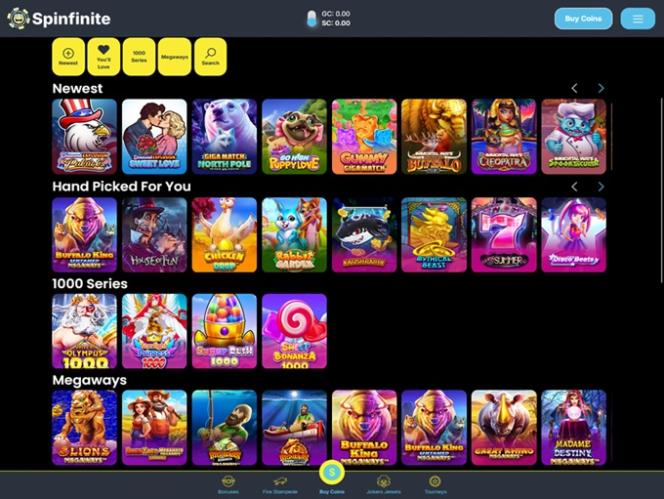 O Spinfinite Casino é um cassino social focado exclusivamente em jogadores que buscam uma vasta biblioteca de slots online , já que esse é essencialmente o único tipo de jogo disponível aqui. Por isso, você pode esperar encontrar praticamente todos os tipos de slots de cassino, incluindo Megaways, com compra de bônus, com pagamento por cluster, Hold & Wins, Hold & Links, slots clássicos, lançamentos recentes, slots de pesca, etc.