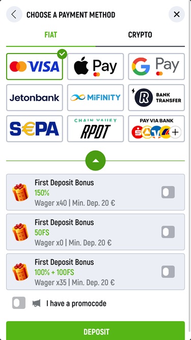 Todos os novos jogadores serão recebidos com um pacote de boas-vindas que inclui bônus para os três primeiros depósitos. Também há cashback, rodadas grátis e outras ofertas promocionais para jogadores ativos regularmente.
