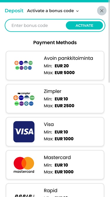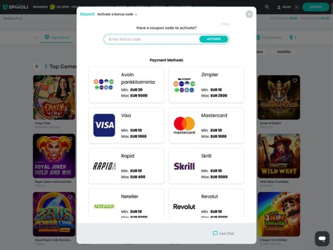 O cassino Spinoli oferece diversos métodos de pagamento, como MiFinity, transferência bancária , Skrill, Neteller, Visa e MasterCard, entre outros, além de várias opções de criptomoedas como Bitcoin, Bitcoin Cash , Ethereum, Litecoin, Ripple, Tether e USD Coin.