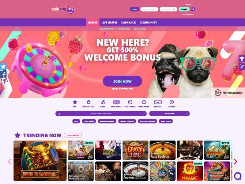 Um adorável pug é o mascote da marca e está sorrindo e cumprimentando os visitantes no topo da página inicial do cassino, que é totalmente funcional e bem projetada.
