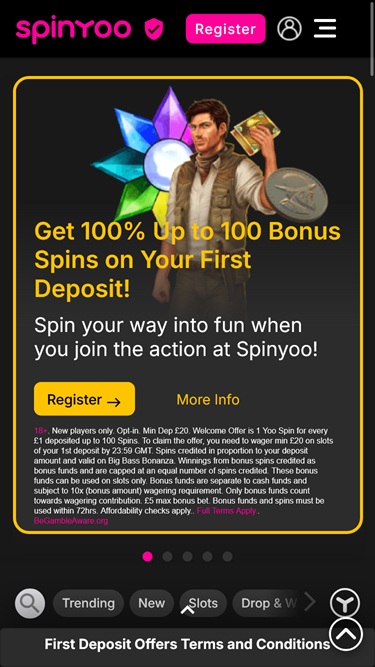 O SpinYoo oferece uma generosa promoção de boas-vindas para todos os jogadores recém-registrados que estão prestes a fazer um depósito. Ela consiste em três bônus de depósito; o primeiro deles inclui rodadas grátis.