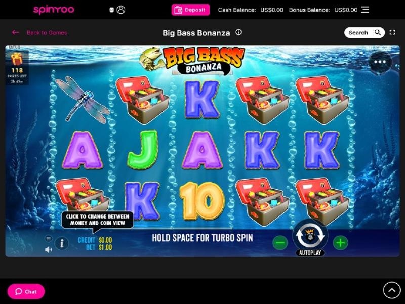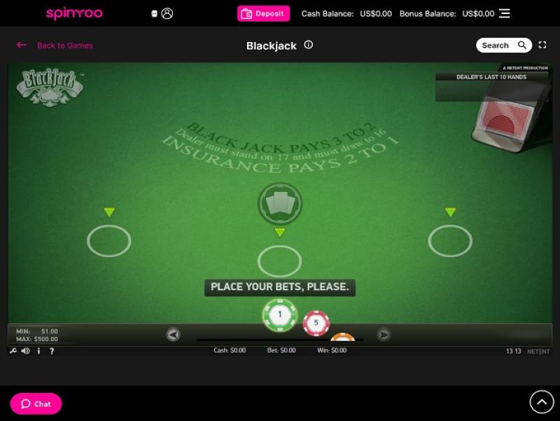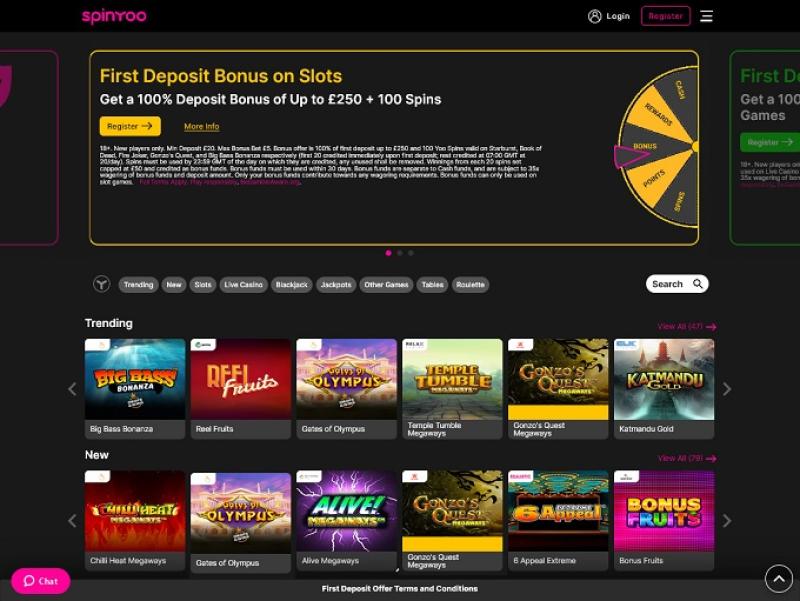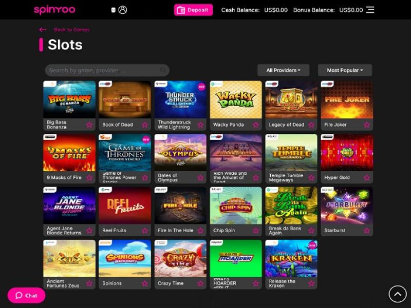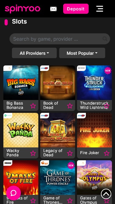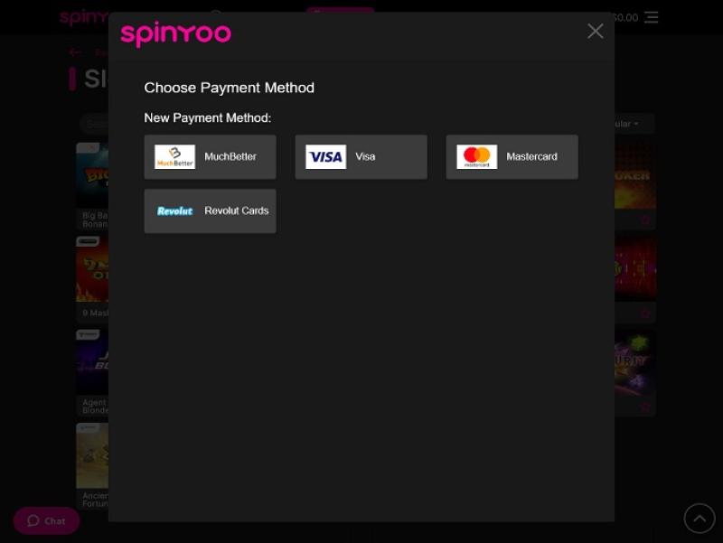 As páginas do cassino são bem organizadas. Um balão de bate-papo para suporte online está localizado no canto inferior esquerdo, e o menu principal fica no lado direito do cabeçalho. Informações úteis sobre o SpinYoo podem ser encontradas em todo o site.