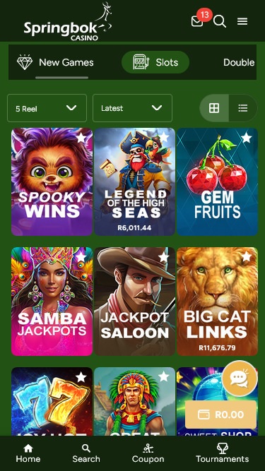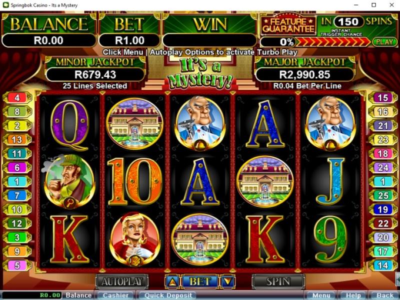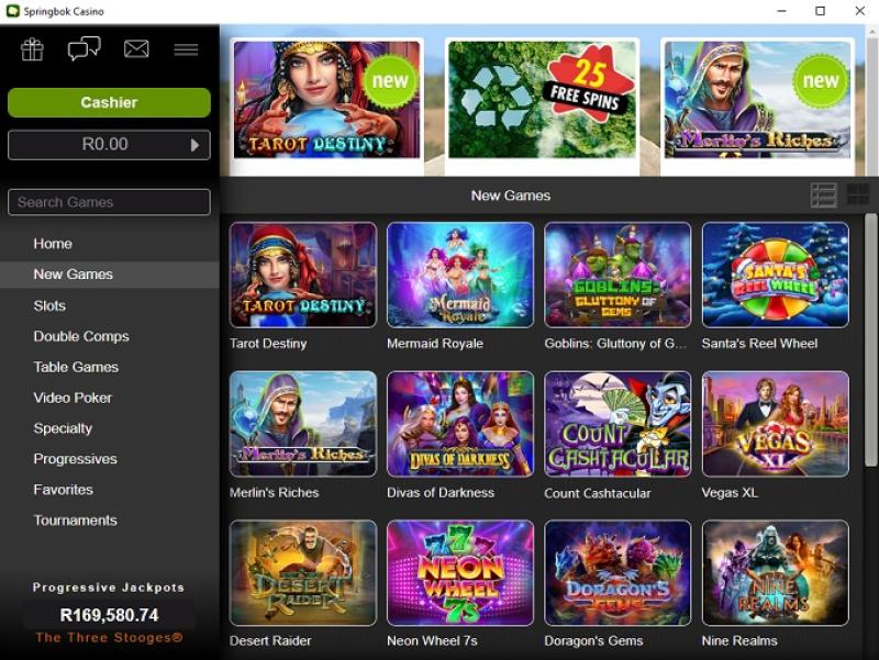 O Springbok Casino oferece uma boa variedade de slots para jogar, incluindo jogos de vídeo e clássicos. Os jogos são quase exclusivamente originais, mas os jogadores também poderão girar os rolos do novo slot Three Stooges. Há vários jackpots progressivos disponíveis, que podem pagar grandes prêmios em dinheiro a qualquer momento. Alguns jogos também são compatíveis com dispositivos móveis, permitindo que você jogue pelo seu smartphone ou tablet.