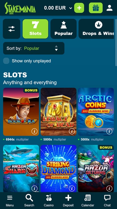 Aqui estão alguns dos jogos que você pode experimentar no StakeMania Casino: Fruit Million, Coin Strike 2: Hold and Win, Bonanza Billion, Crown Coins, Thunder Coins XXL: Hold and Win, Lady Wolf Moon, 4 Pots Riches: Hold and Win, Le Bandit, Electro Coin Link: RUNNING WINS™, Book of Ra, Pink Joker: Hold and Win, Blood, Cash & Crab, Temple Tumble, Dancing Joker, 3 Royal Coins: Hold and Win, Fortune Tiger, Gold Rush with Johnny Cash, Shining Crown e muito mais.