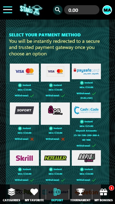 Opções bancárias no StakezOn Casino