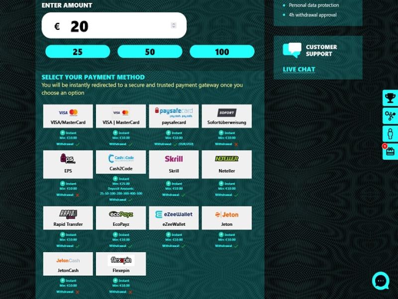 Quando se trata de métodos de pagamento, existem muitas opções, mais do que vimos em muitos outros cassinos online. Você pode depositar seu dinheiro via MasterCard, Visa, Skrill e muitos outros. Há também a opção de fazer depósitos com Neteller ou criptomoedas, se preferir.