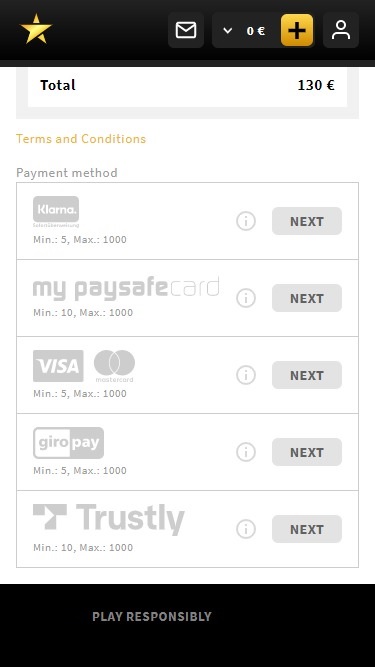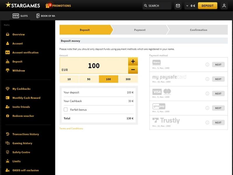 Ao analisar os termos e condições do Star Games Casino, não encontramos nada que se destaque como injusto ou abusivo para os jogadores. O sistema bancário do Star Games Casino é excelente, permitindo transações via American Express, transferência bancária, Click2Pay, iDeal, Maestro, MasterCard, Skrill, Neteller, PayPal, Paysafecard, Visa, SOFORT Banking, GiroPay e muito mais. O cassino paga os ganhos em carteiras eletrônicas instantaneamente, enquanto os pagamentos com cartão de crédito e débito podem levar até 24 horas para serem processados. Transferências bancárias podem levar de dois a cinco dias úteis para serem liberadas. Vale ressaltar que há um limite de saque mensal de € 3.000 neste cassino.