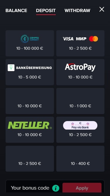 O cassino oferece aos seus jogadores uma ampla gama de opções para depósitos e saques . Os membros podem escolher cartões de pagamento, carteiras eletrônicas, transferências bancárias e opções bancárias com criptomoedas, que se tornaram cada vez mais populares entre os jogadores nos últimos anos.