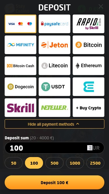 Antes de prosseguir, confira as opções bancárias do Stay Casino, classificadas por métodos de depósito e saque.