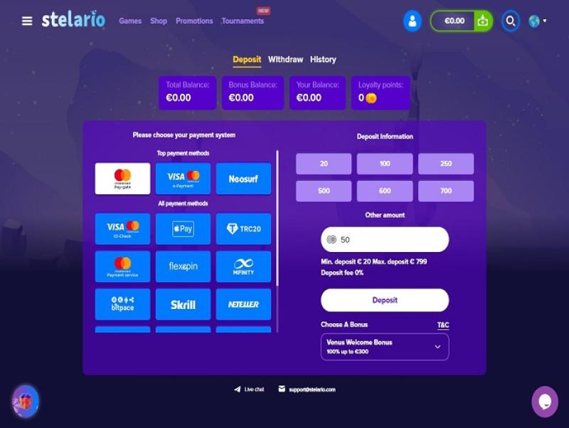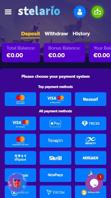 Os termos e condições do Stelario Casino são padrão, e não encontrei nada que me preocupasse em relação à possibilidade de ser injusto para os jogadores.Abaixo estão as diferentes opções bancárias do Stelario, incluindo as opções de depósito e saque que você pode escolher.