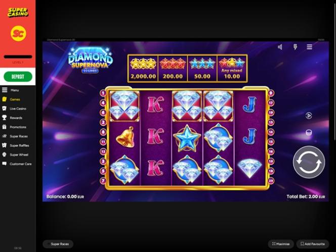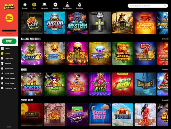 O SuperCasino é alimentado por Amaya, Microgaming, Net Entertainment, 1x2gaming, Barcrest, Big Time Gaming, ELK Studios, Evolution Gaming, iSoftBet, lightningboxgames, Novomatic, Oryx, Play'n GO, Quickspin, Relax Gaming, Thunderkick, Yggdrasil, Endorphina, Wazdan, Booming Games, Stakelogic, Pragmatic Play, Nolimit City, Felt Gaming, Red Tiger Gaming, Spinomenal, Skillzzgaming, Fantasma Games, FunFair, Kalamba, Triple Edge Studios, Northern Lights Gaming, Evoplay, Stormcraft Studios, Switch Studios, Electric Elephant Games, Pocket Games Soft, Bulletproof Games, All41 Studios, Gluck Games, Gameburger Studios, Neon Valley Studios, Golden Rock Studios, Spearhead Studios, Swintt, SpinPlay Games, HungryBear Gaming, SmartSoft Gaming, Real Dealer Studios, Blue Guru Games, On Air Entertainment, Elysium Studios, Games Global, 2by2 Gaming, Bally Technologies, bluberi, Blueprint Gaming, Greentube, NextGen, Push Gaming, Tom Horn Gaming, WMS, Inspired Gaming, Gaming Realms, SG Interactive, Gamomat, Red7Mobile, Scientific Games, Side City Studios, Reel Time Gaming, Iron Dog Studio, Old Skool Studios, Foxium, Just For The Win, Reflex Gaming, PearFiction Studios, Slingshot Studios, Golden Hero, Fortune Factory Studios, STHLM Gaming, 4ThePlayer, AvatarUX, Gamevy, Crazy Tooth Studio, NetGaming, ReelPlay, Japan Technicals Games, Alchemy Gaming, Black Pudding Games, Snowborn Games, Boomerang Studios, Hacksaw Gaming, Max Win Gaming, Gold Coin Studios, Bang Bang Games, Half Pixel Studios, Slotmill, SilverBack Gaming, Peter And Sons, Aurum Signature Studios, Lucksome Gaming, Leap Gaming, Apparat Gaming, Circular Arrow, INO Games, Atomic Slot Lab, Neko Games, Reel Kingdom, Oros Gaming, Indigo Magic, Light & Wonder and Sneaky Slots e seus jogos são oferecidos por meio de uma plataforma de jogo instantâneo baseada na web, aparentemente dispensando o software para download presente em muitos cassinos da Playtech. O jogo também é compatível com dispositivos móveis, permitindo que os jogadores joguem em seus smartphones ou tablets.