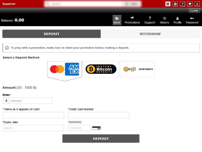O sistema bancário do Superior Casino é razoável, embora um pouco limitado, já que o site atende ao mercado de apostas americano. Depósitos e saques podem ser feitos via Skrill, Neteller, ecoPayz e Visa, enquanto depósitos também podem ser feitos via MasterCard, Paysafecard, American Express e UpayCard. Saques podem ser feitos por cheque ou transferência bancária. Vale ressaltar que há um prazo de processamento de 72 horas para saques, mas transferências via carteira eletrônica são processadas imediatamente após esse período, enquanto transferências bancárias podem levar até 10 dias. Há um limite de saque diário de US$ 500 e um limite semanal de US$ 2.000 para jogadores, embora limites maiores estejam disponíveis para jogadores VIP.