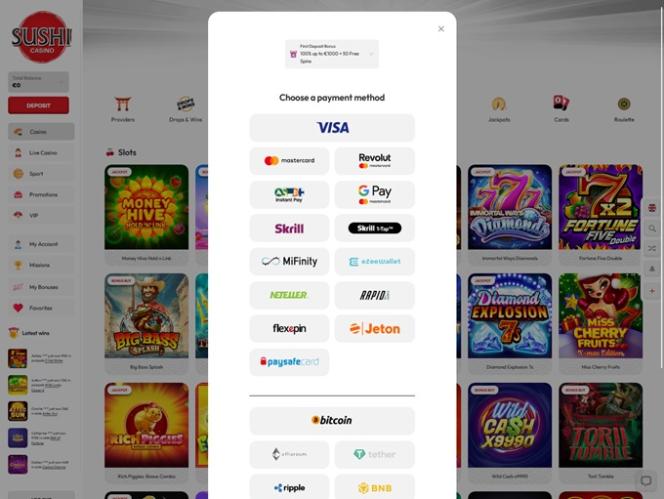 Se você prefere fazer depósitos em criptomoedas ou ainda utiliza métodos de pagamento tradicionais, no Sushi Casino você pode realizar transações financeiras por meio de diversas opções amplamente utilizadas. Lembre-se, porém, que algumas opções podem não estar disponíveis em sua jurisdição de jogos de azar.