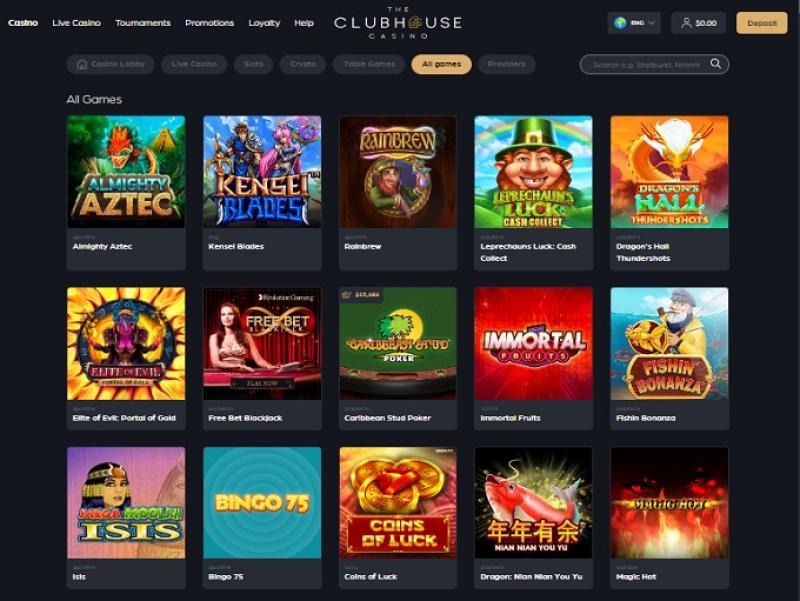 A plataforma do cassino é simples, porém moderna. O Clubhouse possui um logotipo elegante e bem desenhado que atrai muita atenção positiva, cria uma boa imagem geral e agrega valor à identidade visual da marca. Juntamente com o fundo escuro da plataforma, reflete uma grande sensação de elegância e cria uma atmosfera sofisticada para os jogadores de cassino online.