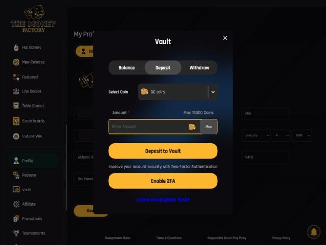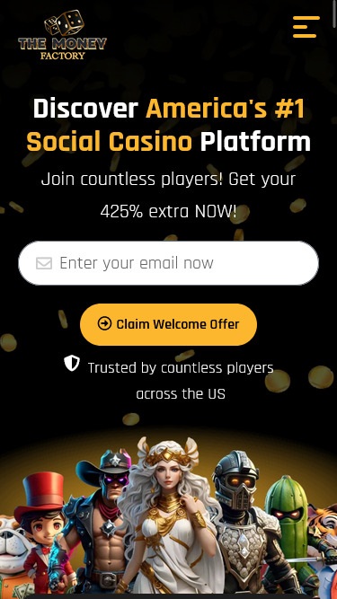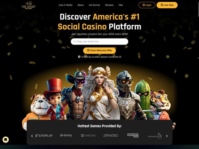 O Money Factory é um cassino social que aceita jogadores dos Estados Unidos, com exceção de Idaho, Louisiana, Michigan, Montana, Nevada, Washington e quaisquer territórios ultramarinos dos EUA. Ao acessar o site, os jogadores notarão imediatamente o cuidado e a atenção dedicados ao design deste cassino social . A paleta de cores principal consiste em fundos escuros lindamente complementados por tons dourados, criando um site com aparência luxuosa, bonito e fácil de entender e navegar. Os jogadores não terão problemas com a interface do usuário, já que navegar por todos os jogos e seções foi simplificado.