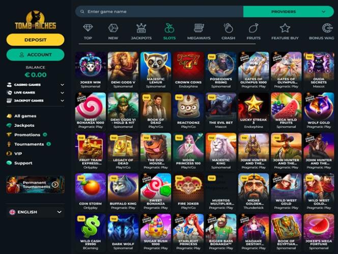 O TombRiches possui uma biblioteca de jogos gigantesca com milhares de títulos disponíveis, e estamos prestes a mergulhar e explorar tudo o que ele oferece para os entusiastas de jogos de azar online. Então, acompanhe-nos nesta aventura!