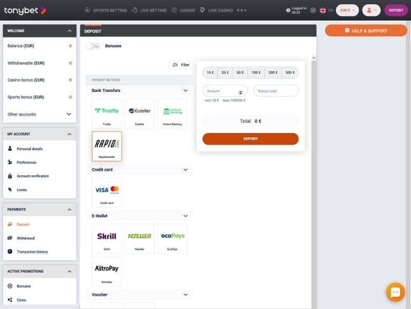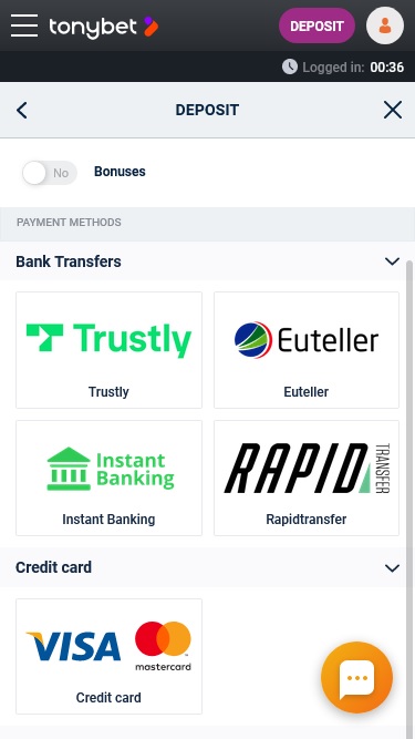 O sistema bancário da TonyBet é bom, pois os jogadores podem movimentar dinheiro usando cartão de crédito, carteira eletrônica e Bitcoin. Há um limite de saque generoso de £48.000 por mês para ganhos, e a velocidade de saque é muito boa. Vale ressaltar que, no primeiro saque, há um período de espera de 48 horas para verificação de identidade.