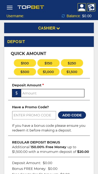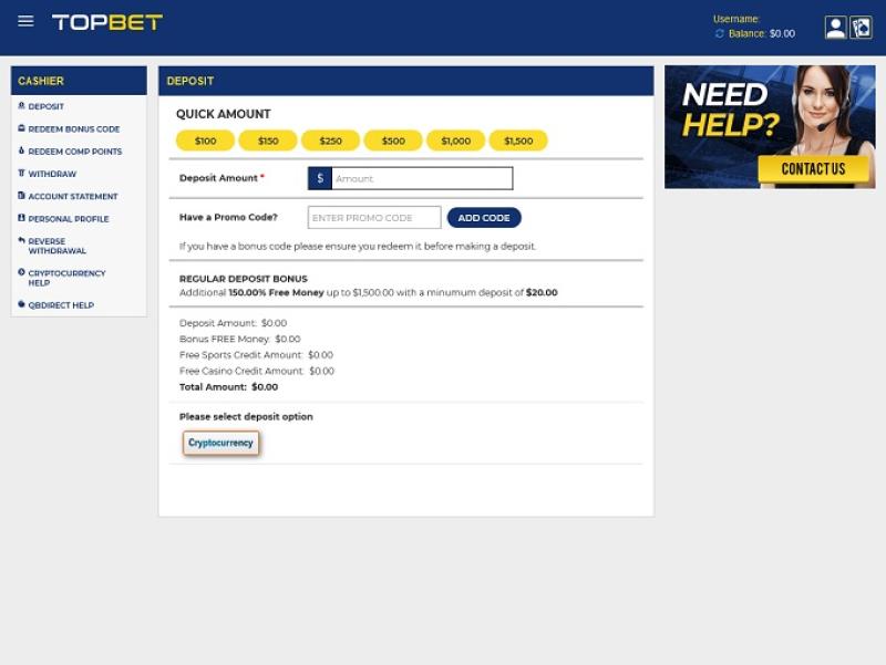 A TopBet permite que os apostadores depositem e retirem fundos usando cartão de crédito e Bitcoin. Os saques também podem ser feitos por cheque, embora haja uma taxa de envio para o recebimento. Os prazos de pagamento variam e o limite máximo de saque é de US$ 2.500 por semana.