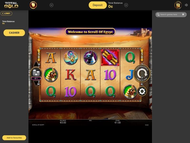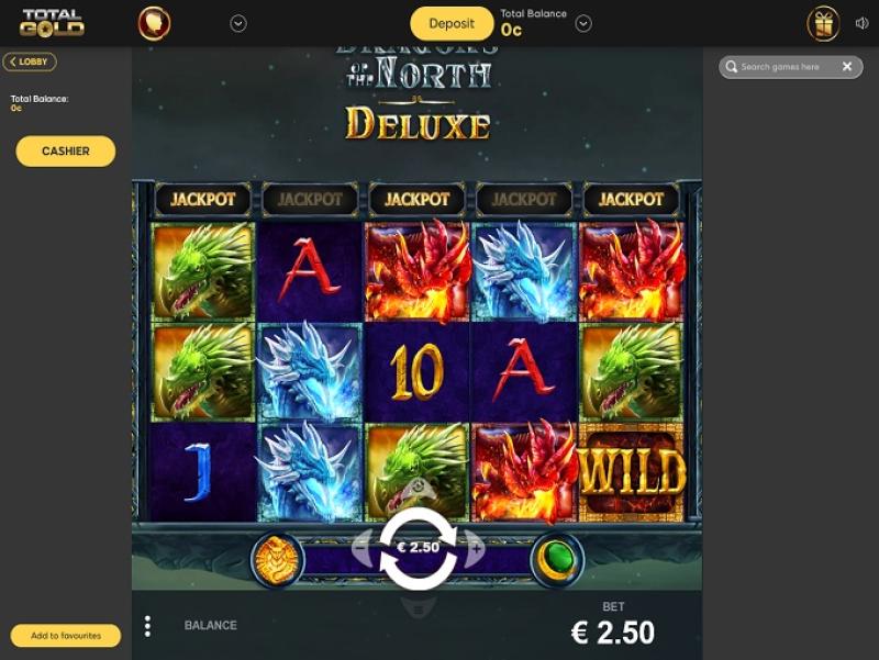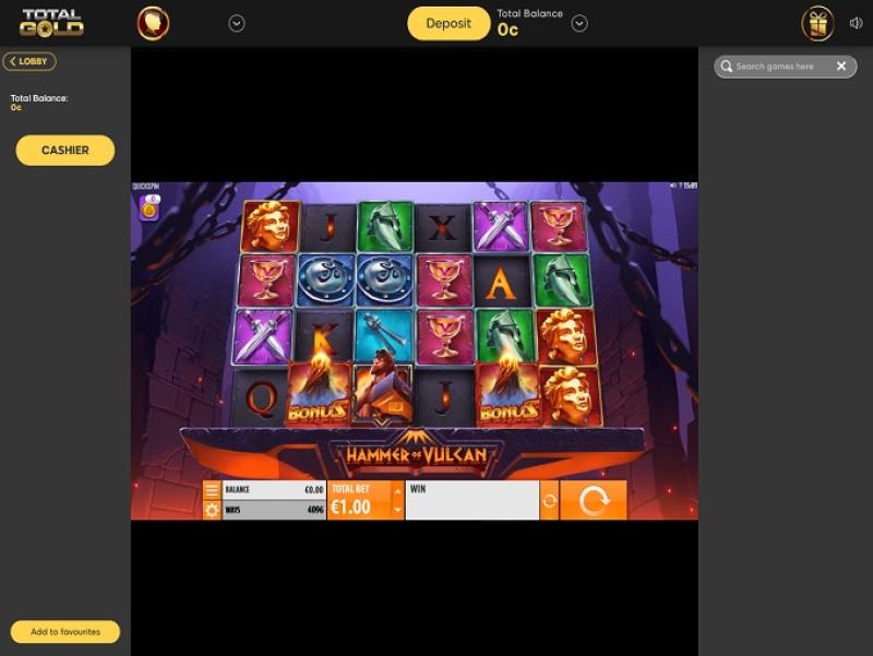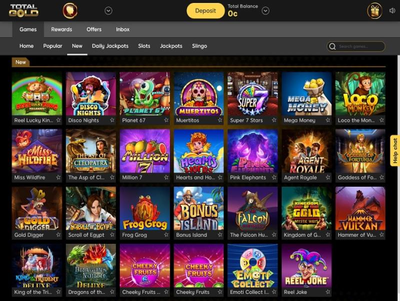 O Total Gold Casino é alimentado por Net Entertainment, Random Logic, Barcrest, Dragonfish, lightningboxgames, Thunderkick, IGT, Wizard Games, Aristocrat, NextGen, Pariplay, WMS, Inspired Gaming and Scientific Games , o que lhe confere uma biblioteca de jogos diversificada. Os jogadores podem acessar o site através de seus navegadores web ou dispositivos móveis.
