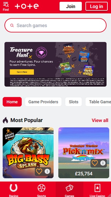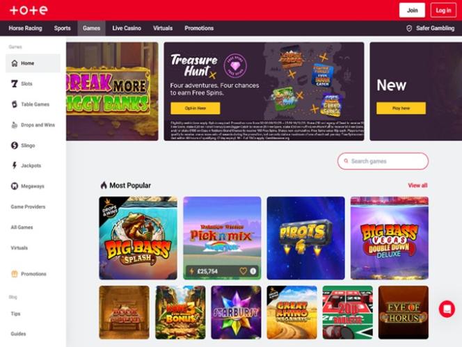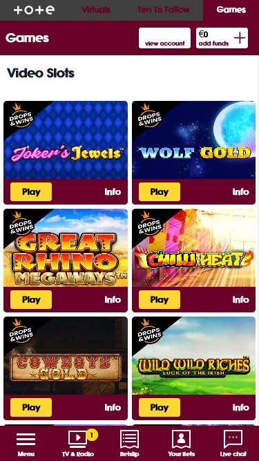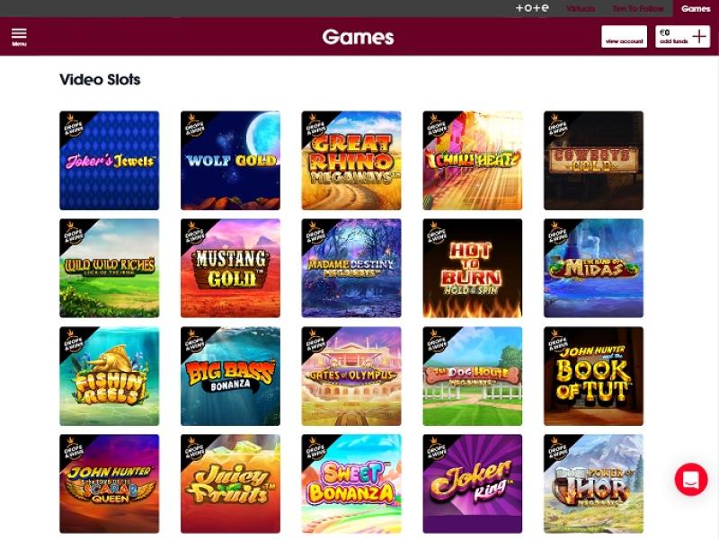Existem dezenas de opções de slots disponíveis para jogar no Totesport Casino, e a versão online conta com uma boa seleção de slots clássicos e de vídeo. Há alguns bons títulos licenciados para jogar aqui, e também jackpots progressivos com milhões em prêmios disponíveis a qualquer momento.