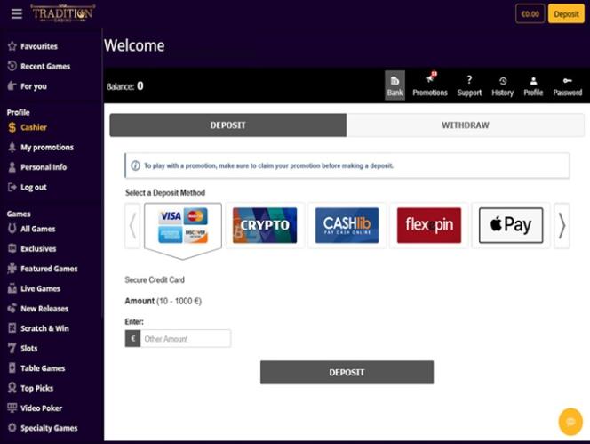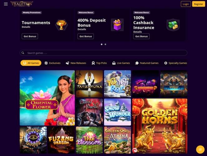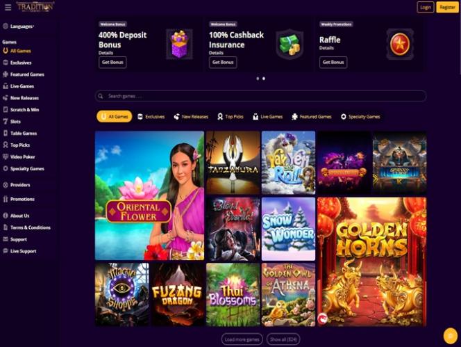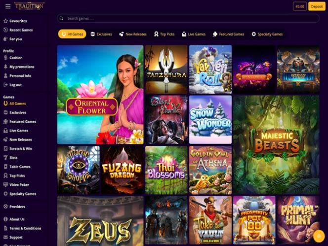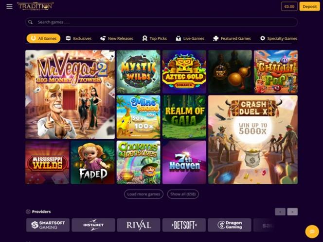 O Tradition Casino é operado por BetSoft, Genesis Gaming, Rival, Saucify, Vivo Gaming, Spinomenal, Felix Gaming, Fugaso, Radi8 Games, Fresh Deck Studios, Woohoo Games, Qora Games, SmartSoft Gaming, Tom Horn Gaming, Genii, Wager Gaming, Dragon Gaming and Dragoon Soft e o software do cassino está disponível tanto para download quanto para jogo instantâneo online, ambos com funcionamento idêntico. Atualmente, o cassino não oferece suporte para jogos em dispositivos móveis.Outros jogos