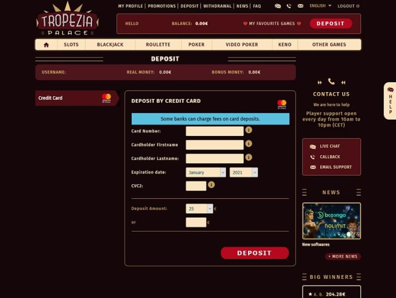 O Tropezia Palace é operado pela Net Entertainment, Playtech, BetSoft, Amatic Industries, Big Time Gaming, ELK Studios, Evolution Gaming, EYECON, Play'n GO, playson, Quickspin, Relax Gaming, Yggdrasil, Wazdan, Booming Games, Stakelogic, Pragmatic Play, Nolimit City, Red Tiger Gaming, Booongo, Spinomenal, Felix Gaming, Red Rake Gaming, Fugaso, Fantasma Games, Kalamba, Skywind, Pocket Games Soft, Bulletproof Games, Gluck Games, TrueLab Games, Amusnet Interactive, Ash Gaming, Push Gaming, Noble Gaming, Reflex Gaming, Wild Streak Gaming, Jade Rabbit Gaming, RubyPlay, 4ThePlayer, AvatarUX, Gamevy, High 5 Games, ReelPlay, Rarestone Gaming, BB Games, Boomerang Studios, Hacksaw Gaming, Max Win Gaming, Bang Bang Games and Peter And Sons , que oferece centenas de jogos aos jogadores através de sua plataforma online. O processo de cadastro no cassino é rápido e eficiente, levando apenas alguns minutos, e a navegação pelo site é fluida. Jogadores que procuram um jogo específico podem usar a função de busca, que se mostrou bastante eficaz na localização de jogos de mesa ou caça-níqueis.Blackjack
