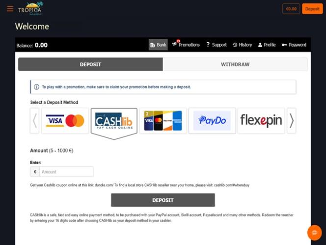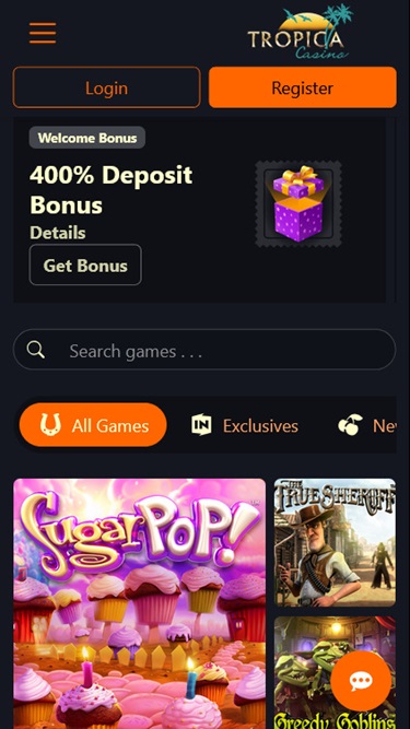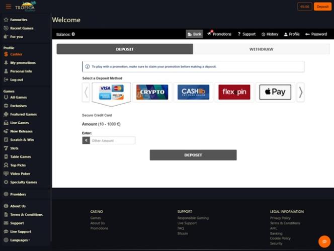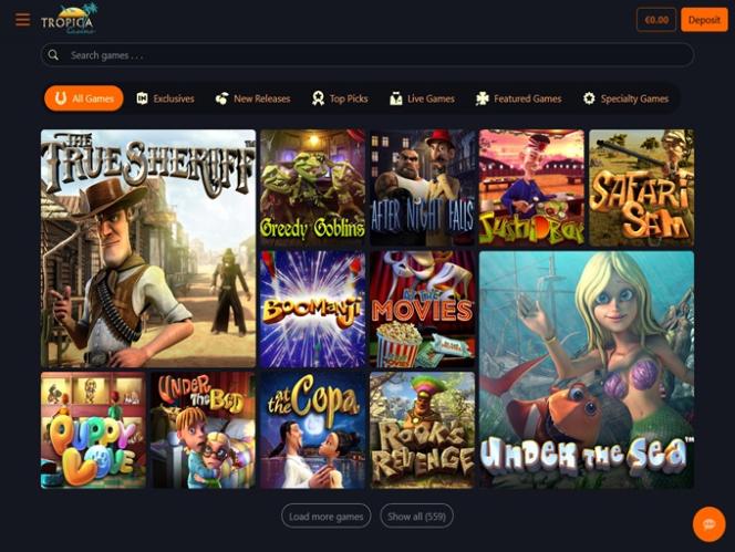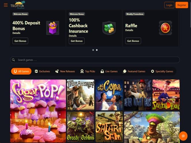 O Tropica Casino é alimentado por BetSoft, Genesis Gaming, Rival, Saucify, Vivo Gaming, Arrows Edge, Radi8 Games, Fresh Deck Studios, Woohoo Games, Qora Games, Genii and Dragon Gaming , o que lhe confere uma vasta biblioteca de jogos, incluindo títulos que muitos jogadores americanos talvez ainda não tenham tido a oportunidade de experimentar. O casino está disponível através de um software para download, bem como no modelo de jogo instantâneo, que permite jogar diretamente pelo navegador web.Outros jogos