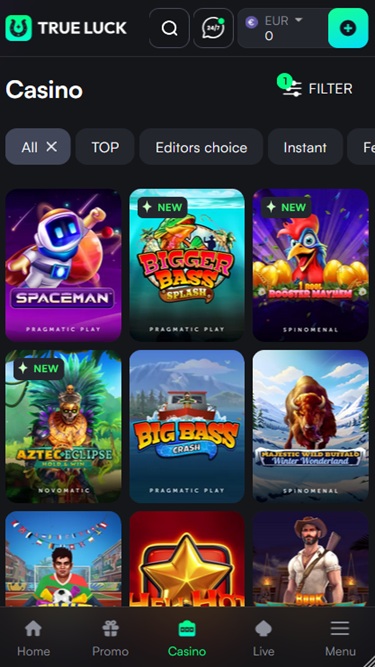 Jogos de Crash como Aviator, Plinko XY, Rocket Dice, Piggy Tap e Mines também são escolhas muito populares entre os jogadores do Trueluck Casino, pois são incrivelmente divertidos e oferecem rodadas explosivas que não exigem muito tempo ou habilidade para dominar. Além disso, a marca também oferece diversos jogos de loteria.