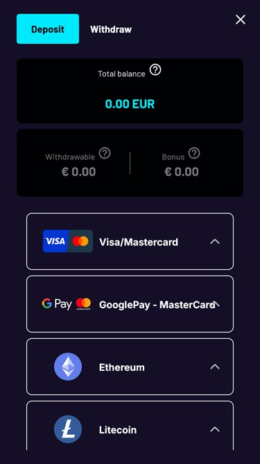 Como já mencionamos, este é um cassino online que aceita criptomoedas, o que significa que aqui você pode fazer pagamentos com opções populares de criptomoedas, além de contar com algumas opções tradicionais, como transferência bancária, Google Pay, Revolut, Interac e os principais cartões de crédito e débito.
