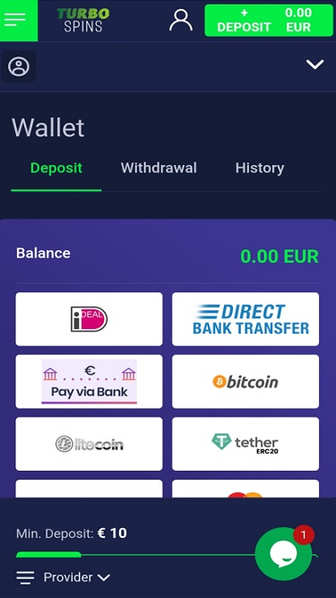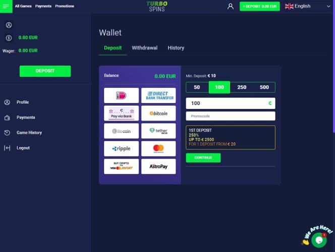 A TurboSpins aceita criptomoedas populares e oferece transações de pagamento rápidas por meio de métodos de pagamento confiáveis. Além disso, os jogadores podem contar com um atendimento ao cliente profissional disponível 24 horas por dia, 7 dias por semana.