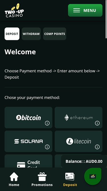O Two-Up Casino possui um programa de recompensas. Os jogadores ganham 1 ponto a cada $10 apostados, e 100 pontos equivalem a $1 em créditos para usar no cassino.