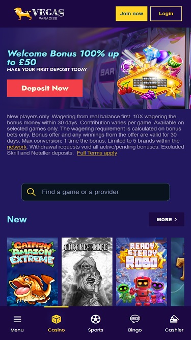 Vegas Paradise - Cassino novinho em folha com ótimo layout e jogos MG incríveis. Eles estão recebendo novos jogadores com bônus de 100%, que podem ser combinados em até 200 créditos, e têm requisitos de aposta de 50x.