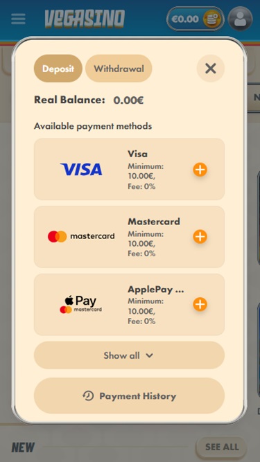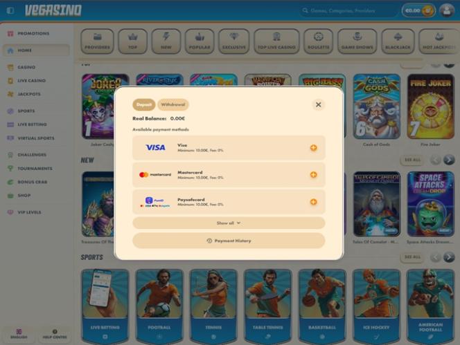Oferecer opções de pagamento aos jogadores deve ser uma das principais prioridades das marcas de cassino. É por isso que o Vegasino permite que seus usuários depositem e saquem usando diversos métodos, como Visa , Mastercard , Skrill , Paysafecard , Neteller , MiFinity e Jeton . A marca também aceita criptomoedas como opção de pagamento, incluindo Bitcoin , Dogecoin , Litecoin e Tether .
