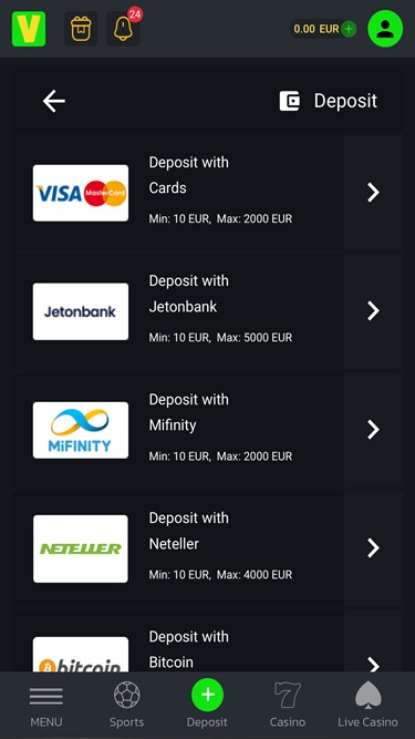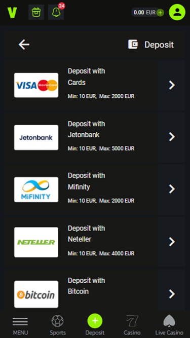 💸 Saque mínimo€10 (Mifinity)/€20 (Other methods)