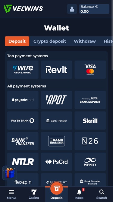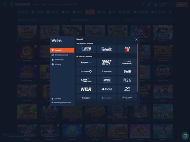 Para gerenciar seus fundos no cassino Velwins, você poderá usar diversos métodos de pagamento, incluindo opções populares como Visa , Mastercard, Transferência Bancária, Flexepin , Skrill , Neteller , MiFinity e Paysafecard . Além disso, os jogadores podem usar várias criptomoedas como métodos de pagamento válidos, incluindo Bitcoin, Cardano , Dogecoin, Ethereum , Litecoin , Solana , Tron , USD Coin e Tether.